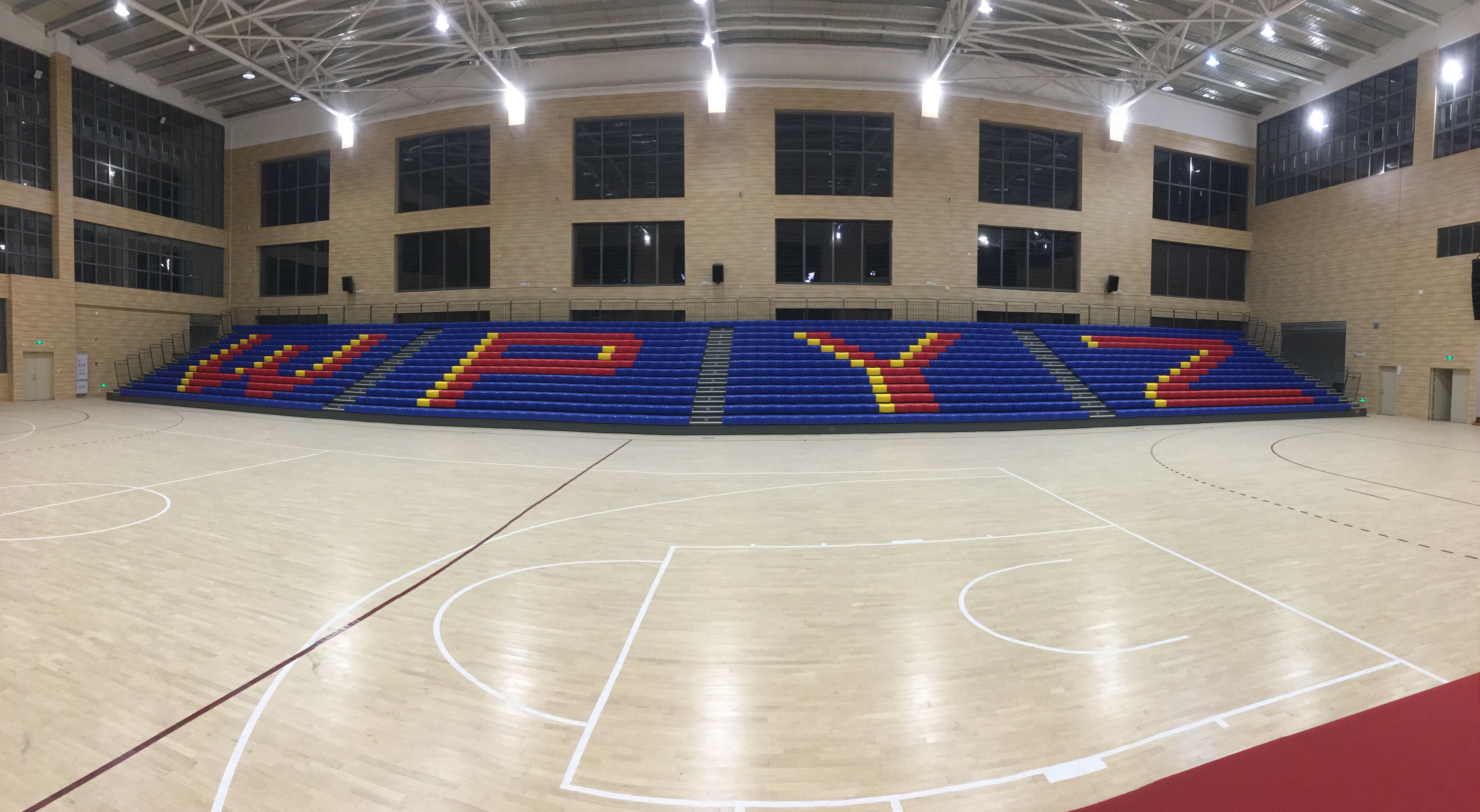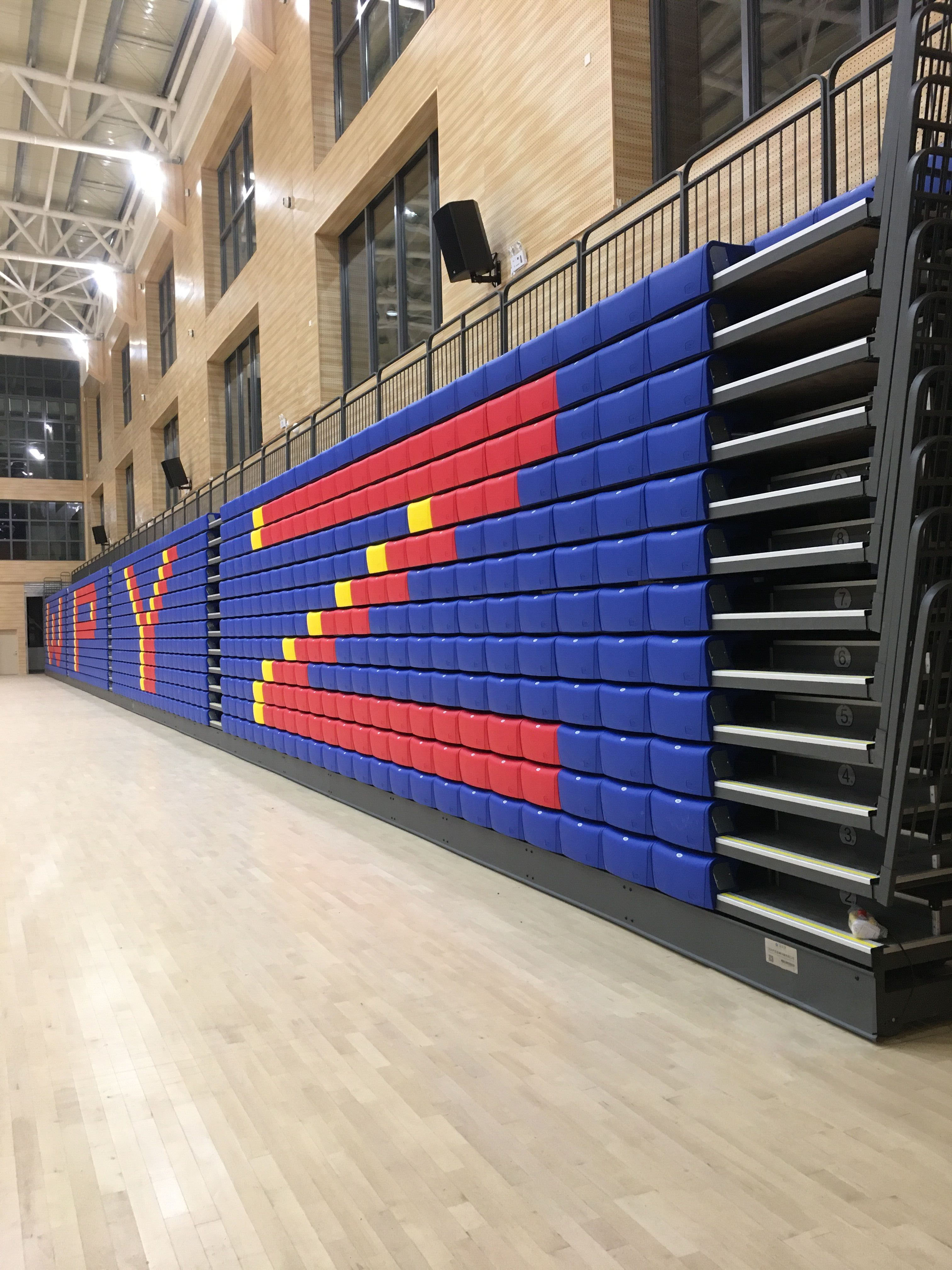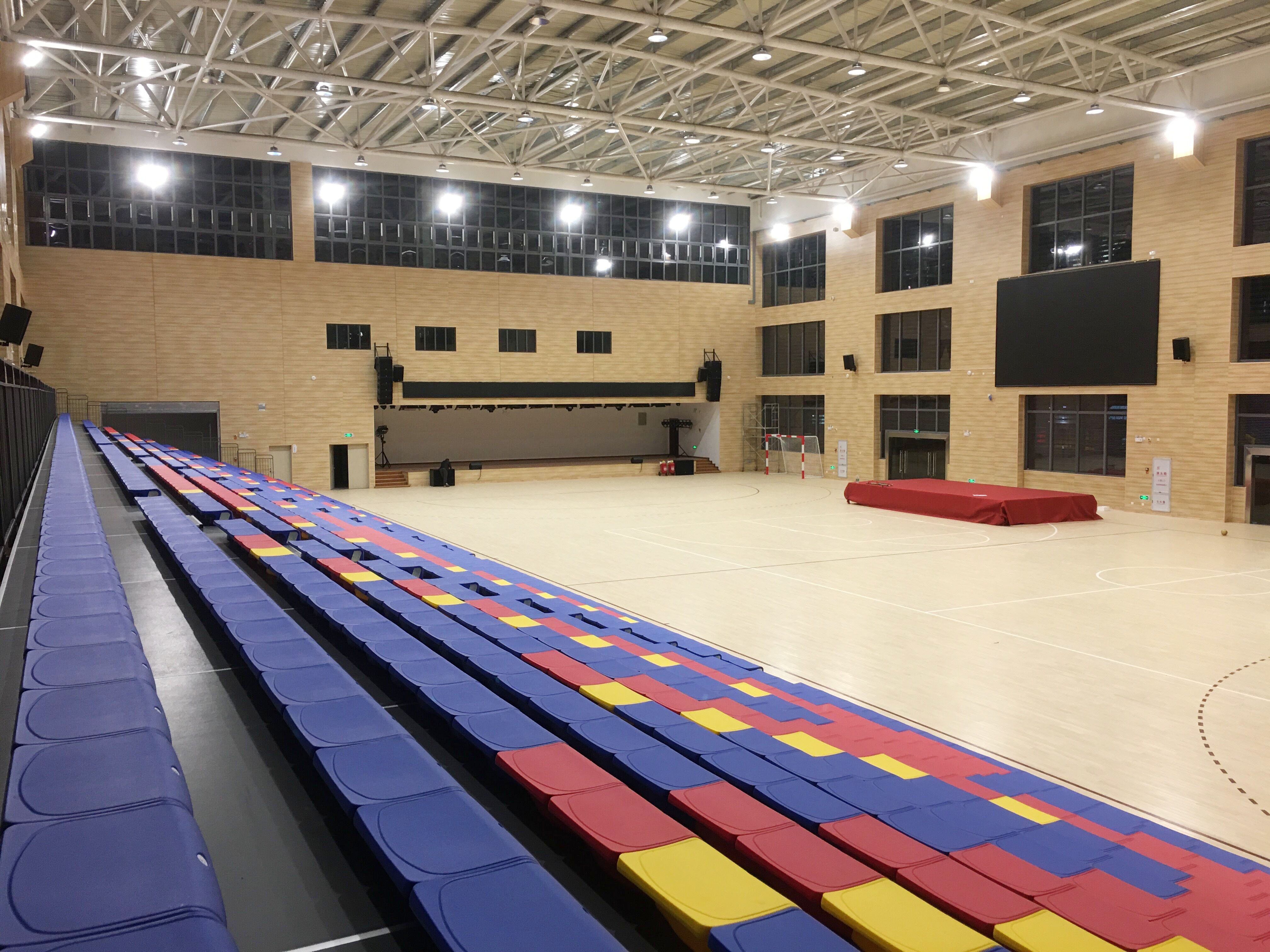 二層為手球活動(dòng)中心兼籃球館、羽毛球館,排球館的多功能訓(xùn)練比賽場地以及配套設(shè)施等。場館可以進(jìn)行手球、籃球、羽毛球、排球等項(xiàng)目的訓(xùn)練以及比賽還可以滿足學(xué)?;顒?dòng)、文藝表演、展覽等多功能的使用需求,場館內(nèi)有設(shè)置1200座移動(dòng)伸縮看臺(tái),均由專業(yè)活動(dòng)場館伸縮看臺(tái)座椅生產(chǎn)制造商-深圳優(yōu)藝體育設(shè)備有限公司提供,在運(yùn)動(dòng)模式時(shí),活動(dòng)看臺(tái)整體靠墻收回匣子形狀,將場地讓出,進(jìn)行可以布置1個(gè)手球場、2個(gè)籃球場(4個(gè)排球場、8個(gè)羽毛球場),進(jìn)行訓(xùn)練和比賽使用。在會(huì)議模式時(shí),活動(dòng)看臺(tái)整體伸出,通過場地設(shè)計(jì),最多可以容納千人會(huì)議,這時(shí)學(xué)校大會(huì)可在室內(nèi)完美舉行。