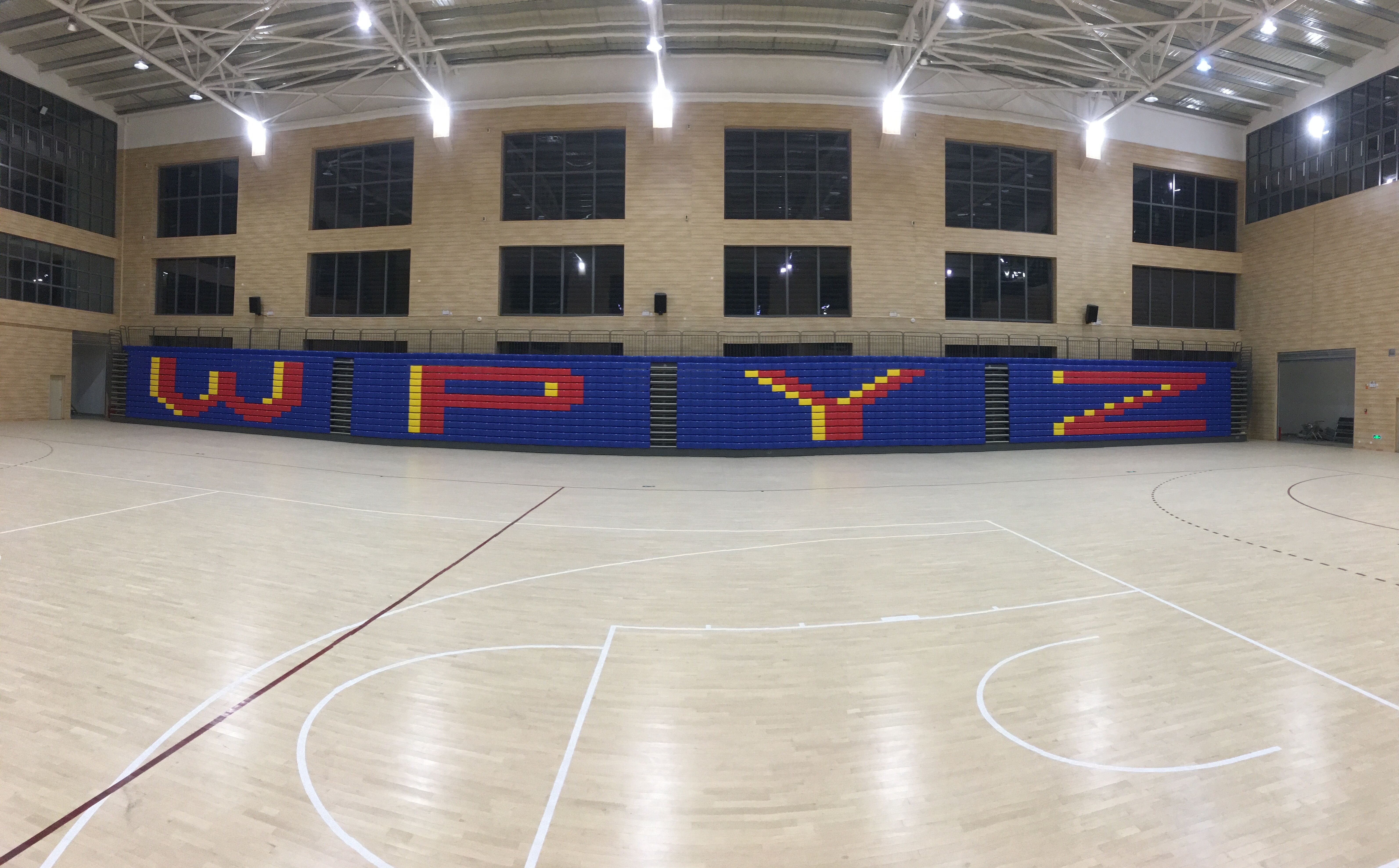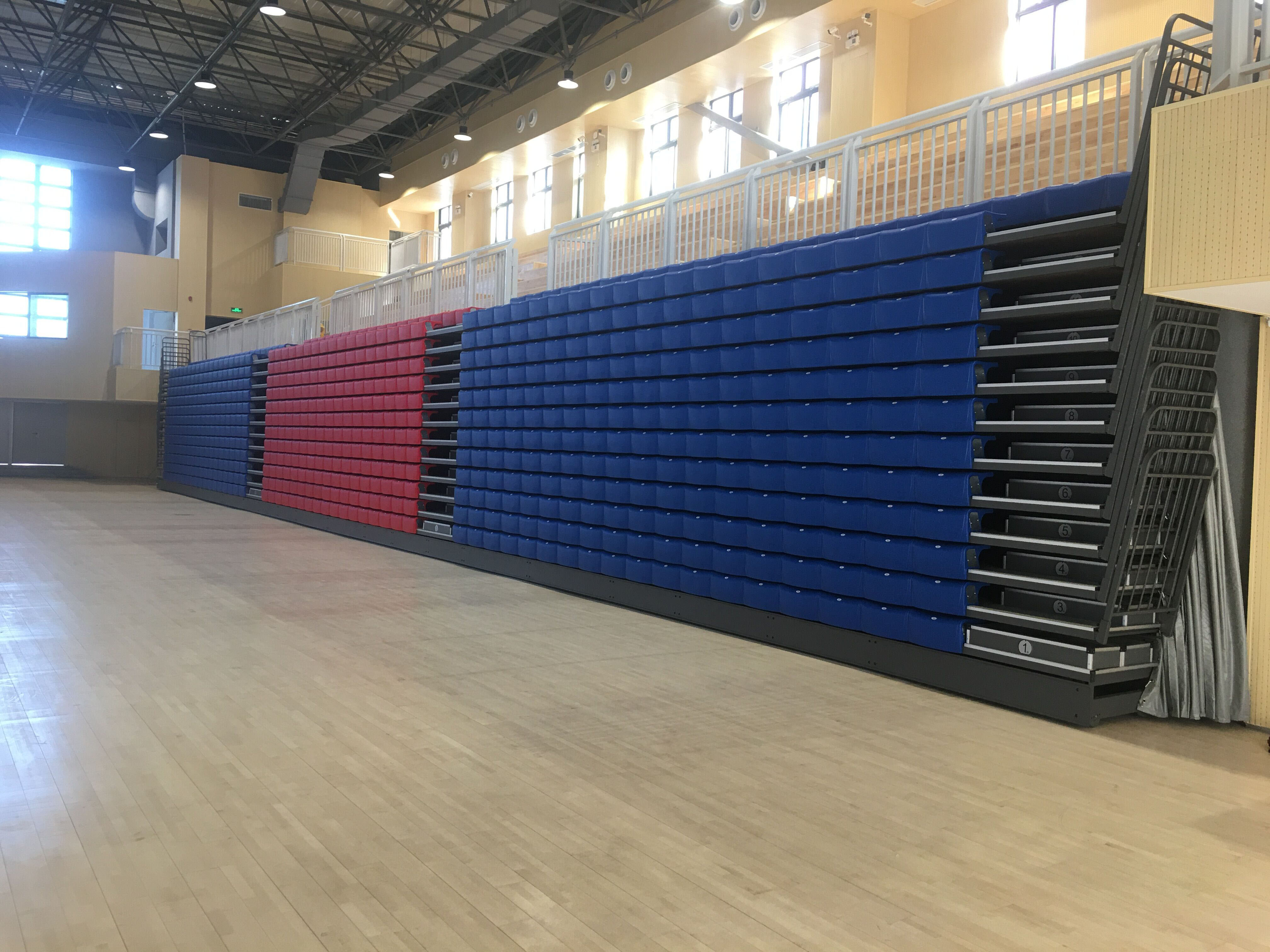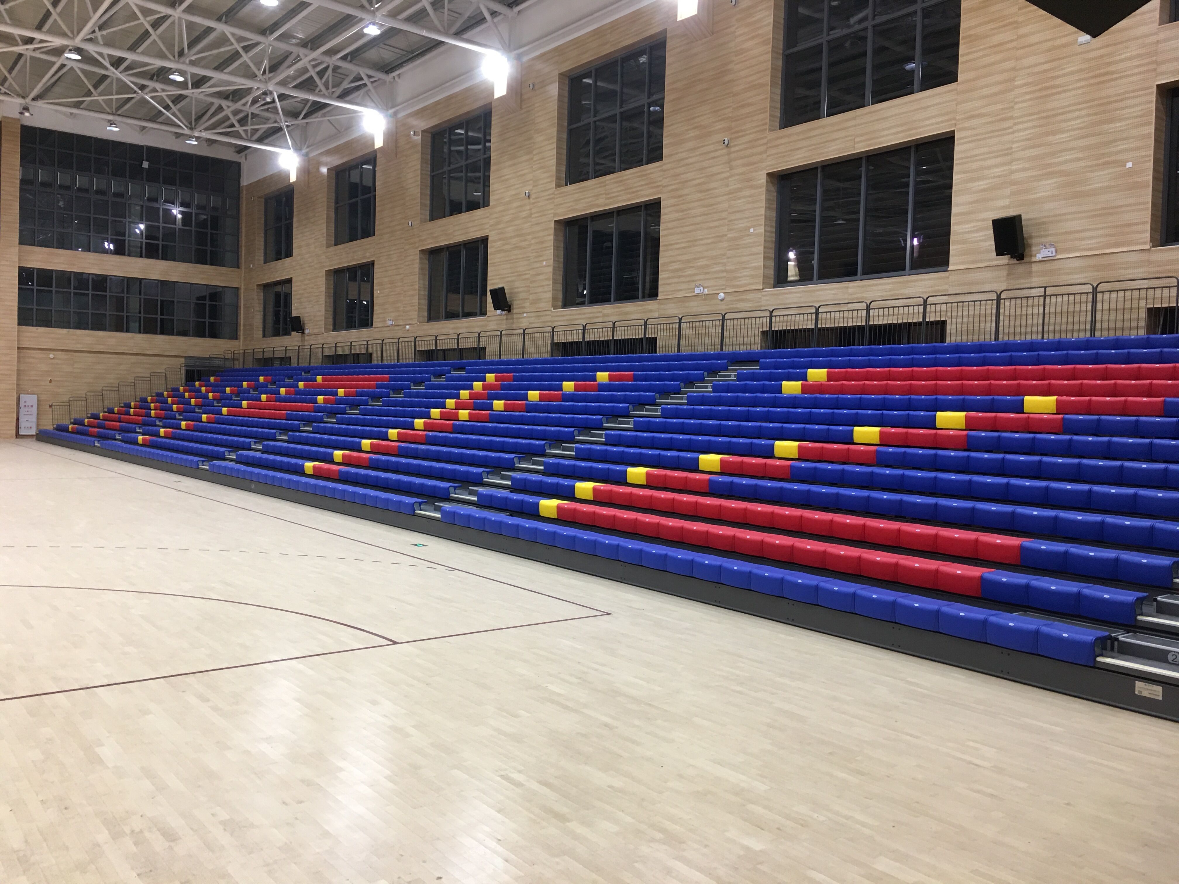 二層為手球活動(dòng)中心兼籃球館、羽毛球館,排球館的多功能訓(xùn)練比賽場地以及配套設(shè)施等。場館可以進(jìn)行手球、籃球、羽毛球、排球等項(xiàng)目的訓(xùn)練以及比賽還可以滿足學(xué)?;顒?dòng)、文藝表演、展覽等多功能的使用需求,場館內(nèi)有設(shè)置1200座移動(dòng)伸縮看臺(tái),均由專業(yè)活動(dòng)場館伸縮看臺(tái)座椅生產(chǎn)制造商-深圳優(yōu)藝體育設(shè)備有限公司提供,在運(yùn)動(dòng)模式時(shí),活動(dòng)看臺(tái)整體靠墻收回匣子形狀,將場地讓出,進(jìn)行可以布置1個(gè)手球場、2個(gè)籃球場(4個(gè)排球場、8個(gè)羽毛球場),進(jìn)行訓(xùn)練和比賽使用。在會(huì)議模式時(shí),活動(dòng)看臺(tái)整體伸出,通過場地設(shè)計(jì),最多可以容納千人會(huì)議,這時(shí)學(xué)校大會(huì)可在室內(nèi)完美舉行。